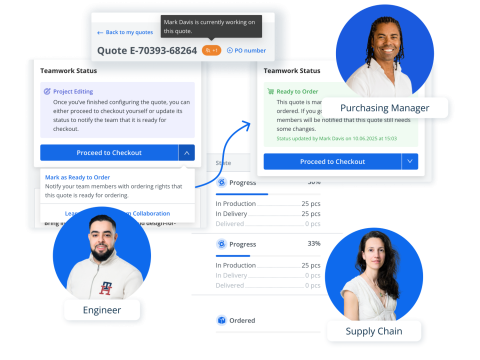 Saat täyden näkyvyyden ja hallinnan organisaatiosi tuotantoputkesta. Teamspace tarjoaa reaaliaikaisen tilausten seurannan, jaetun projektihistorian ja yksilöllisiä ilmoituksia. Tämä varmistaa, että koko tiimisi pysyy ajantasalla monimutkaisista ja isoista projekteista.
