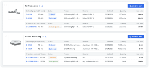 Hallitse helposti digitaalista varastoasi. Osakirjasto synkronoi automaattisesti 3D-mallit ja piirustukset tarjouksistasi ja tilauksistasi. Tämä varmistaa, että tekniset tietosi ovat aina nopeasti saatavilla, kun haluat pyytää uuden tarjouksen ja tilata osia uudelleen.